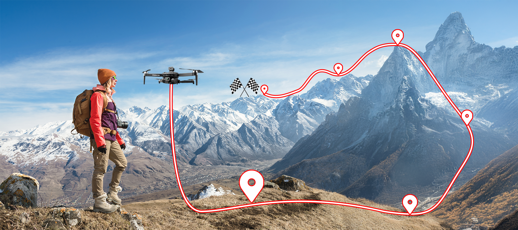 Espandi la tua Mappa Aerea. Il drone Vassco raggiunge un volo a raggio ultra-lungo fino a 3000 metri, grazie al suo potente motore e sistema di segnale. Liberati dai limiti, sorvola montagne e laghi ed esplora il mondo da prospettive mai viste prima. Il raggio ultra-lungo significa uno spazio creativo più ampio e l'autentica libertà di catturare quei panorami distanti e magnifici.