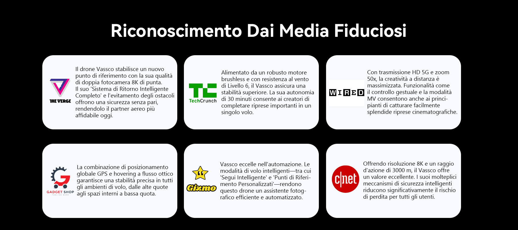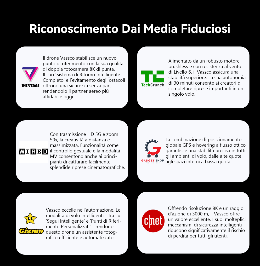 Così è nato il Drone GPS Vassco. Il Drone GPS Vassco offre stabilità e precisione come mai prima d'ora. Il suo sistema di volo intelligente, la navigazione GPS e l'evitamento avanzato degli ostacoli lo mantengono saldo in qualsiasi ambiente, mentre la configurazione a doppia telecamera 8K con potenziamento AI assicura che ogni scatto sia nitido, vibrante e cinematografico.