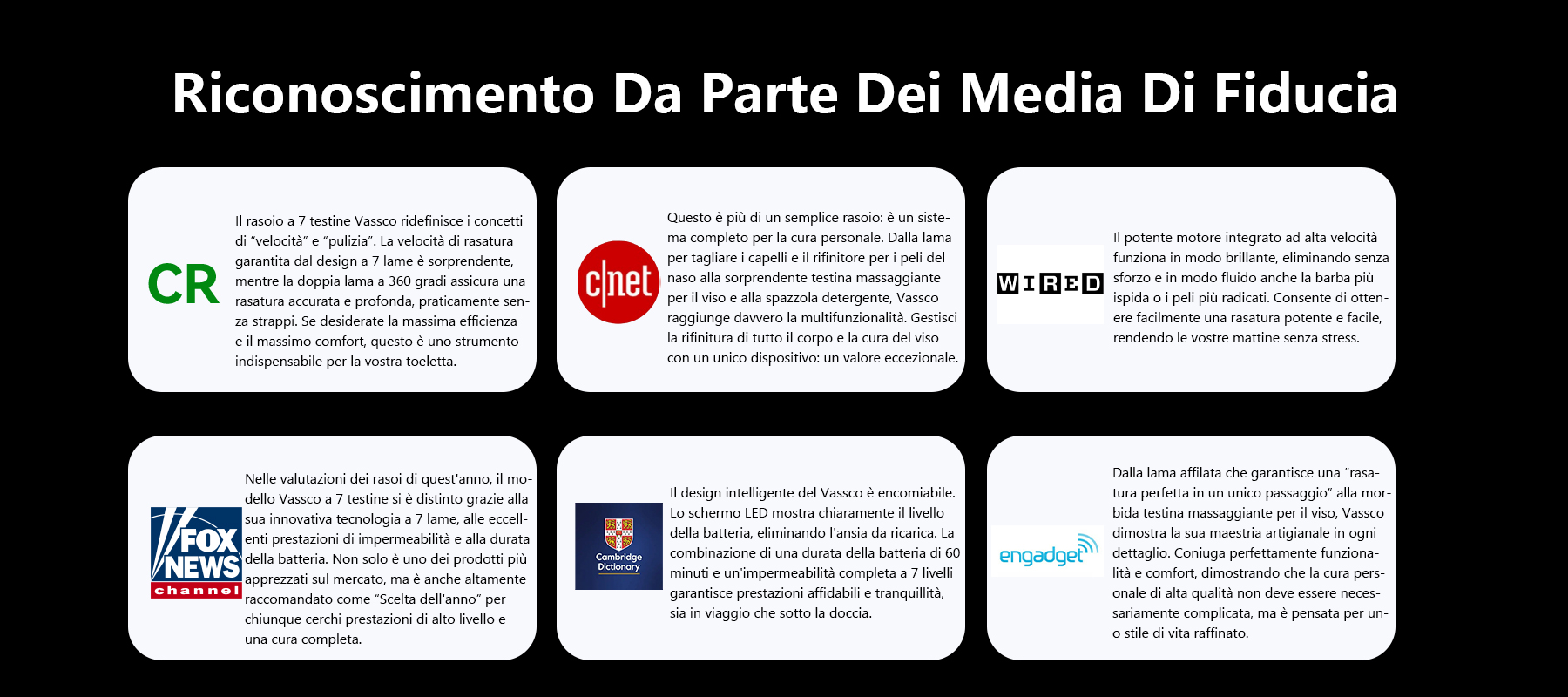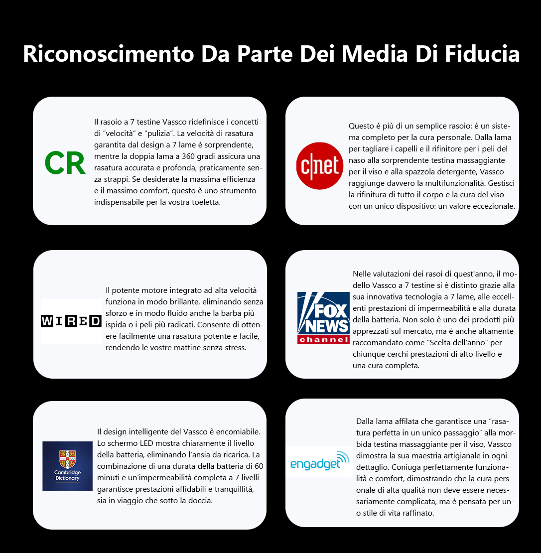 Il risultato: il Kit da Barba 6-in-1 Vassco da Uomo. Con un motore potente, testine flottanti a 360° e lame di precisione, offre una rasatura veloce, liscia e senza sforzo ogni volta. La missione di Vassco: rendere la cura personale rapida, confortevole e precisa in modo che tu possa concentrarti sull'apparire e sentirti al meglio.